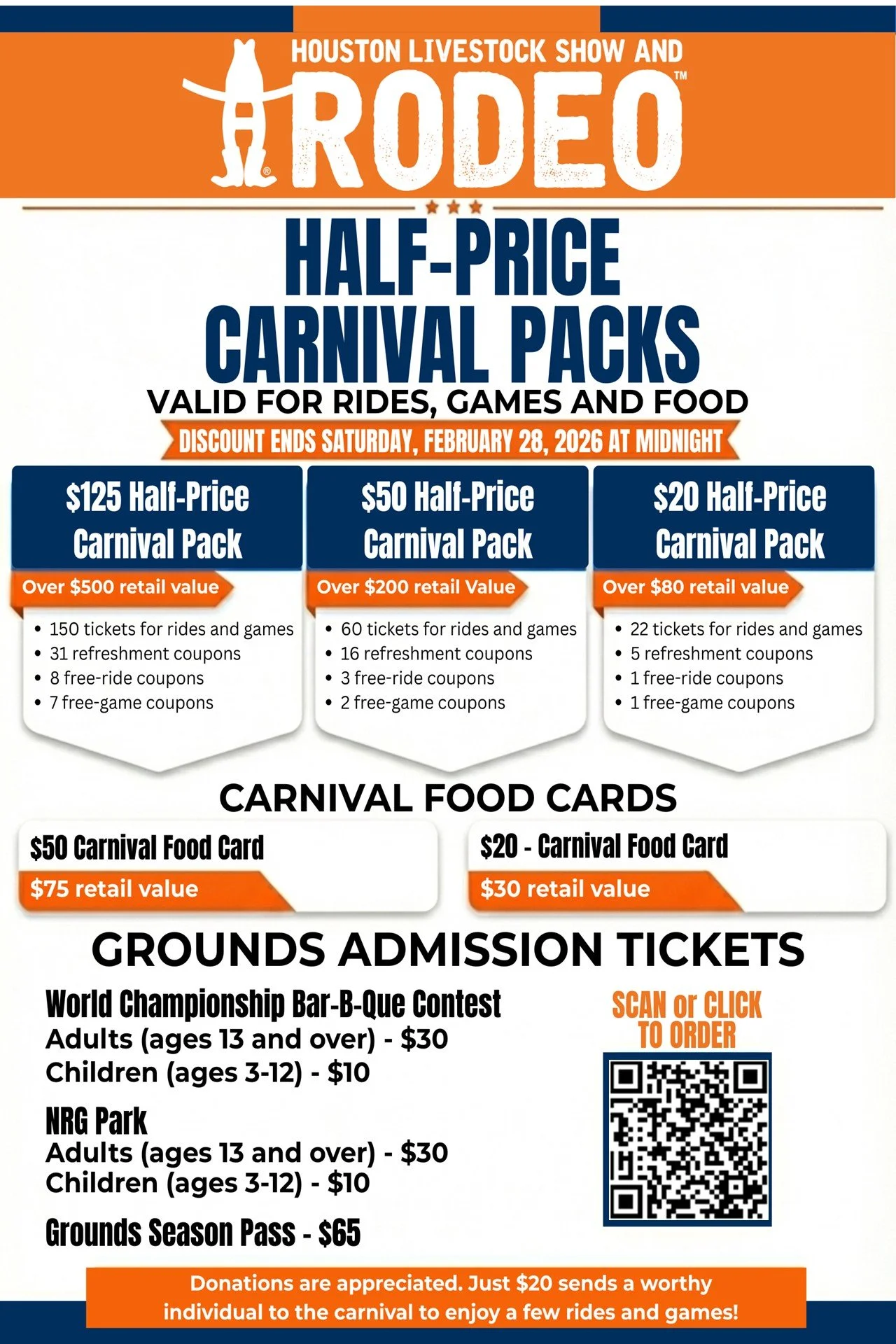 Order your half price carnival packs and discount food cards for the Houston Livestock Show and Rodeo.